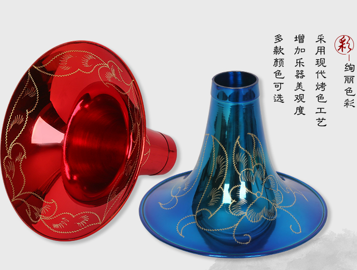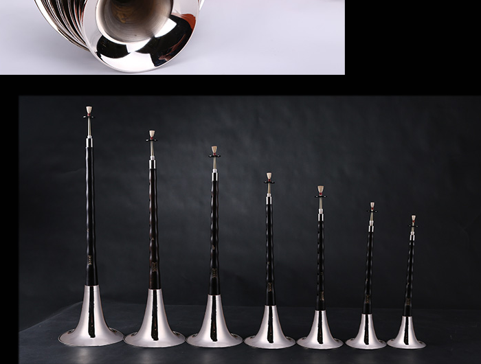 其次,大唢呐的琴杆比我们常见的琴杆要更粗更长,一般选择丁木或者是泡桐木,长度在60至80公分。因为具体的发声需要,整个琴杆明显需要分为两个部分,上小下大,上面一部分的直径(1.5±0.2)cm,下面的一半渐变为3cm,琴杆的两面一共有8个气孔,可以发出不同的音,背面有一个音孔,正面有7个,音孔之间的间距为3至4cm。大唢呐有特色的部分就体现在琴杆的部分,是区别与常见唢呐的标志。“大喇叭”的原材料一般为泡桐木,像一个喇叭一样张开,上面可以连接琴杆,下面的口径较大(30.00±5.00)cm。与小唢呐、中型唢呐不同的是,大唢呐的“大喇叭”碗口壁很厚。 因为大唢呐整体比较大,所以,琴杆与“大喇叭”是可以拆解分开的。但是碗口与琴杆的连接还直接的影响大唢呐的定调,这也给唢呐合奏提供了可能。